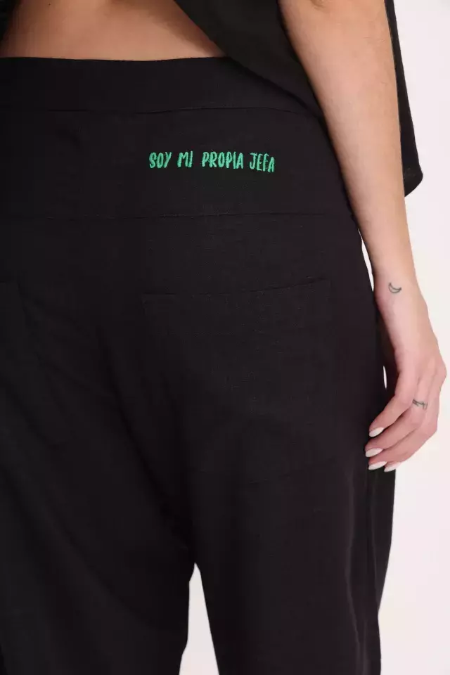 Pantalón Manuel, confeccionado en lino. Tiro medio alto, fit tipo slowchy, con bolsillos tipo jeneros en el trasero del pantalón y recortes en el frente con dos maxi bolsillos. Bordado inspirado en la obra de la artista de esta temporada, Brenda Ruseler.