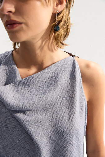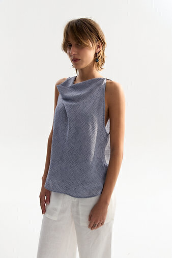 Top sin mangas confeccionado en un tejido liviano con sutil textura cruzada. Escote halter drapeado que aporta movimiento y un aire relajado, mientras su fit holgado lo convierte en una prenda fresca y versátil para múltiples ocasiones. Esta prenda hace set con nuestro Pantalón Nodo Marino.
